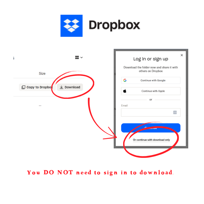 When prompted to log in to Dropbox, scroll down and click “Or continue with download only”.